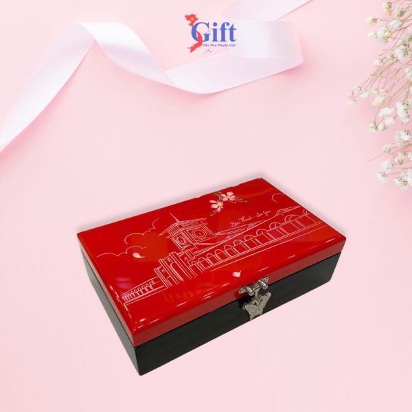 Hộp Trang Sức Sơn Mài Vẽ Chợ Bến Thành Màu Đỏ SGSMHD1424-1