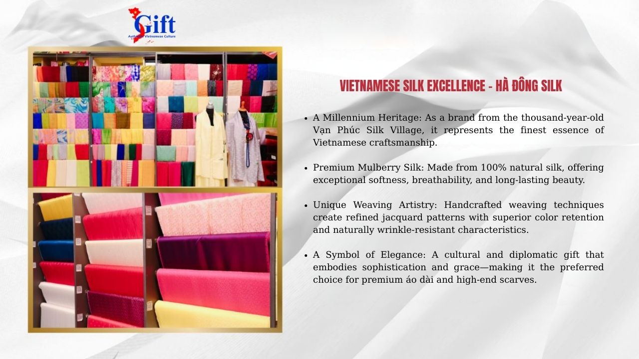 Using Hà Đông silk is not only an appreciation of the beauty of mulberry silk, but also a way of honoring a piece of Vietnamese cultural heritage. With SGift, every scarf becomes a gift infused with national pride—worthy of being presented to those you truly cherish.