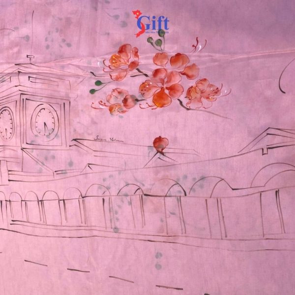 Hand-Painted Silk Scarf Featuring Bến Thành Market – Pink Scarf, Red Gift Box – Premium Gift Set