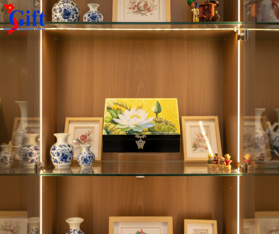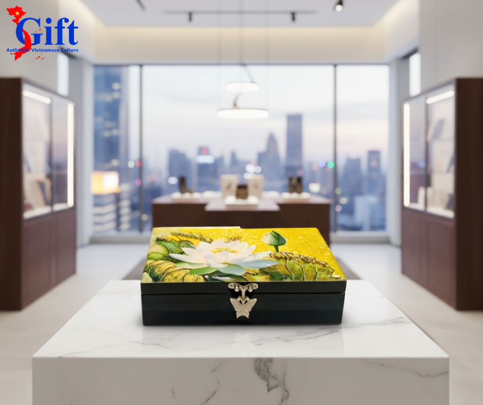 The lacquered jewelry box with white lotus on a golden background is the perfect choice for those who appreciate sophistication, elegance, and the timeless beauty of Vietnamese cultural heritage.