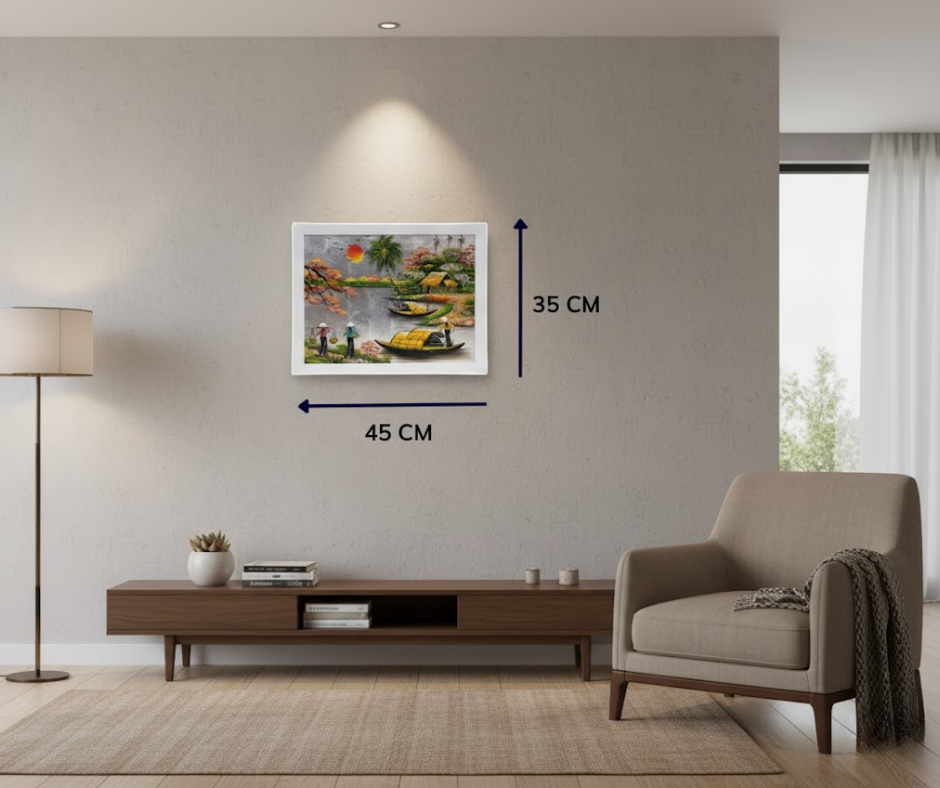The Silver-Leaf Lacquer Painting Set “Countryside Scene” with White Frame SGTSM3040 is not just a decorative item—it is a true artwork that reflects the soul and craftsmanship of Vietnamese heritage. Inspired by peaceful, familiar rural landscapes such as ancient banyan trees, river docks, and golden rice fields, the painting evokes tranquility and serenity, soothing the soul amid the busy pace of urban life.