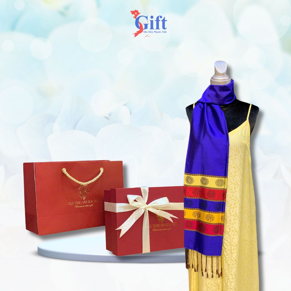 A bright red carton box with a pure white ribbon, printed with the golden text “Vietnamese Cultural Gift” and the SGift Vietnam logo, accompanied by a premium red paper bag with a ribbon handle, makes it easy to carry or present as a gift. The combination of vivid colors and meticulous craftsmanship makes the scarf not just an accessory but a meaningful gift, ready to delight the recipient.