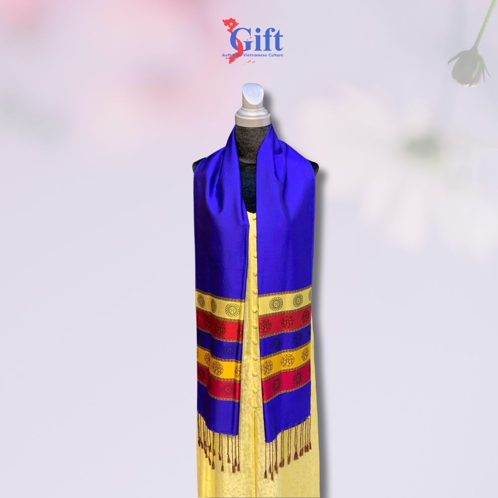 The silk scarf appears as a work of art with an ideal length of 180cm, easily draped around the neck or shoulders. The deep mysterious blue version shimmers under light, evoking nobility and elegance. Meanwhile, the vibrant yellow version features multicolored border patterns – gold, bright red, blue, and purple – along the length of the scarf, finished with delicate fringes, creating a lively and energetic feel.