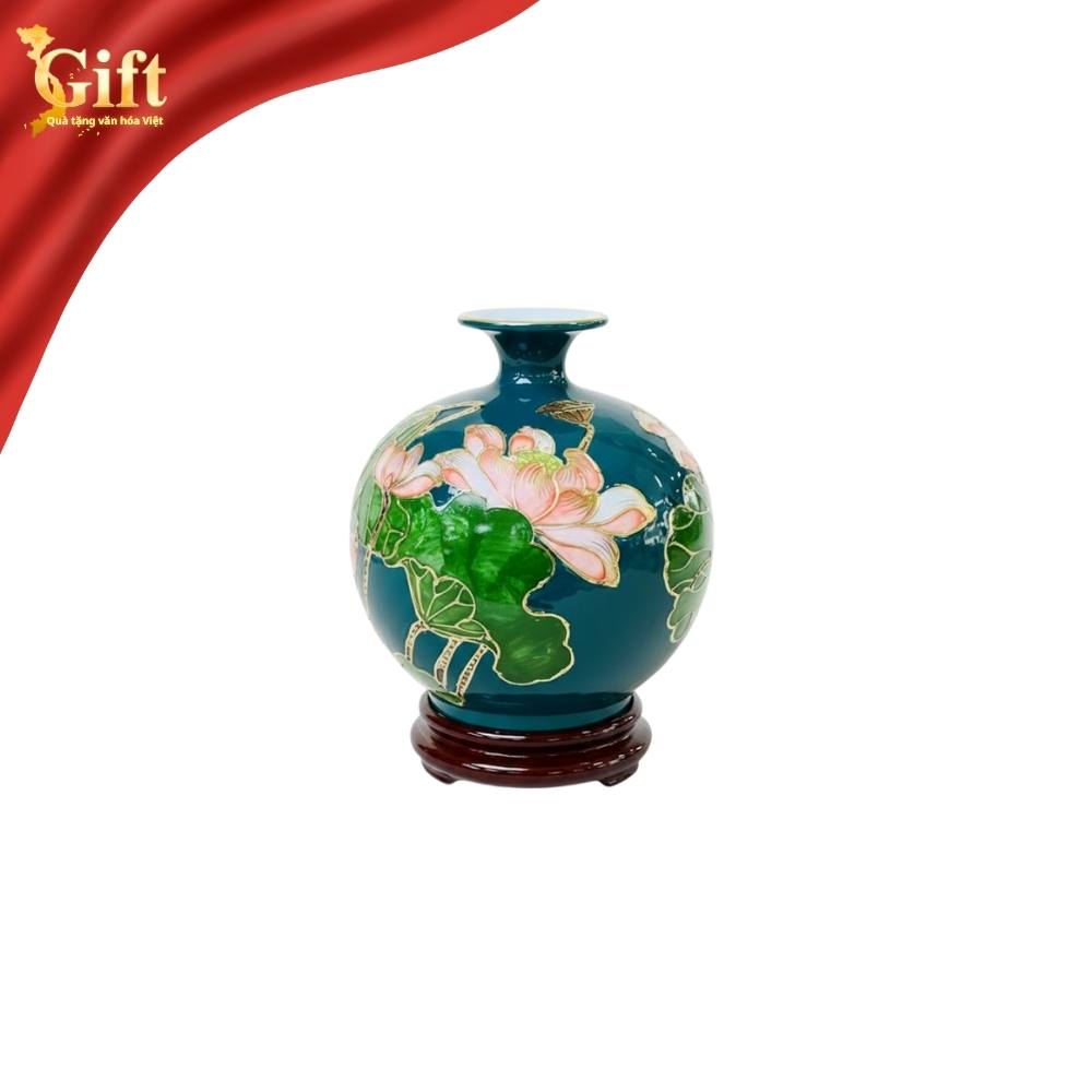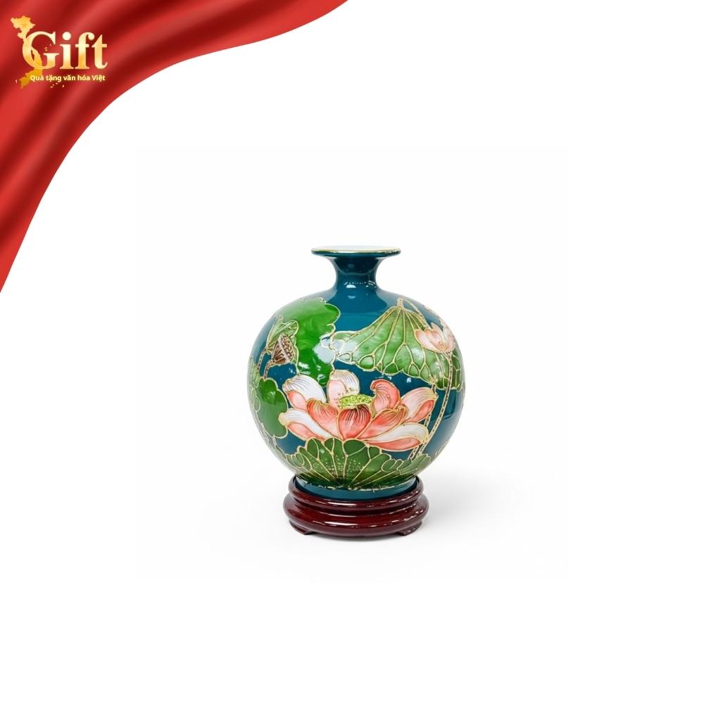 Bình hút tài lộc gốm Tràng nền xanh họa tiết hoa sen vẽ vàng kim (MNV-VBT22.4) là biểu tượng của sự sung túc, bình an và thịnh vượng — một món đồ phong thủy không thể thiếu cho không gian sống và làm việc hiện đại.