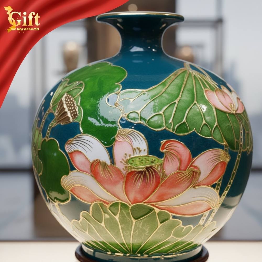 Họa tiết hoa sen được đắp nổi 3D kết hợp vẽ vàng kim cao cấp. Trong văn hóa Á Đông, hoa sen biểu tượng cho thanh cao, tinh khiết và an yên. Việc trưng bày bình hoa sen giúp điều hòa khí thịnh vượng, mang lại sự thịnh vượng và cuộc sống sung túc. Màu nền xanh đặc cực kỳ phù hợp với gia chủ mệnh Thủy và mệnh Mộc, giúp gia tăng năng lượng tích cực.