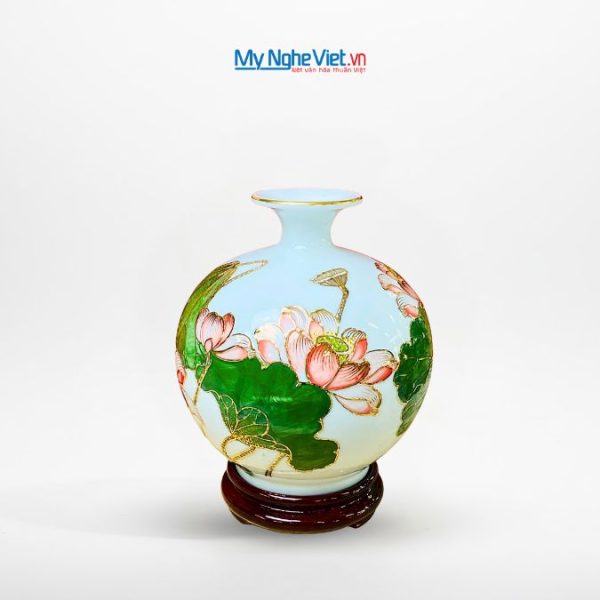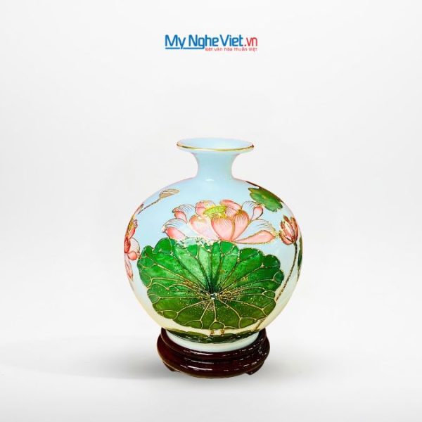 Điểm nhấn của chiếc bình là họa tiết hoa sen – biểu tượng của sự thanh cao và thuần khiết trong văn hóa Việt. Sự kết hợp giữa kỹ thuật vẽ tay tinh xảo và đắp nổi tỉ mỉ mang đến vẻ đẹp quyền quý.