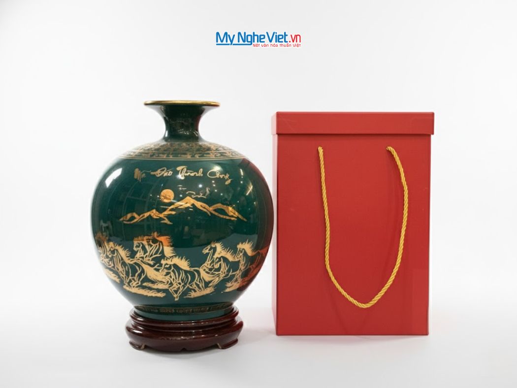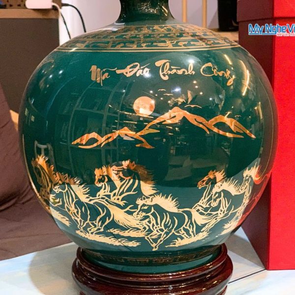 - Nhị Cảnh: Bình khắc họa hai bức tranh phong thủy đối lập nhưng bổ trợ cho nhau. Mặt trước vẽ cảnh Mã Đáo Thành Công (tám con ngựa phi nước đại), tượng trưng cho sự thăng tiến, kinh doanh phát đạt, thắng lợi nhanh chóng. Mặt sau bình vẽ cảnh Thuận Buồm Xuôi Gió, hàm ý mọi công việc đều hanh thông, suôn sẻ.