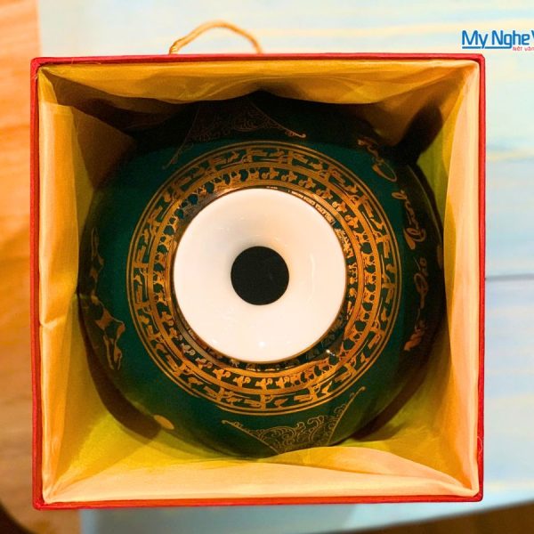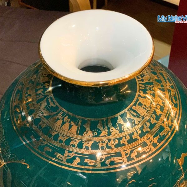 - Đông Sơn Kim Bảo: Đây là sự kết hợp giữa hai giá trị cao quý. Đông Sơn gợi nhắc đến nền văn hóa Trống Đồng hùng vĩ, biểu trưng cho sức mạnh và sự trường tồn. Kim Bảo là vật quý bằng vàng, tượng trưng cho sự giàu sang phú quý. Họa tiết này được thể hiện bằng kỹ thuật vẽ Vàng kim 2 mặt lộng lẫy cùng viền cổ trống đồng trang trọng trên thân bình, mang ý nghĩa thu hút tài khí bền vững, vững chắc như kim loại.