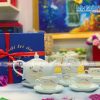 Với dung tích 600ml, men xanh cổ vịt rất đẹp mắt và sang trọng, logo được in vàng kim- dòng vàng 24k công nghiệp toát lên sự cao cấp trong phần quà tặng. Sản phẩm không chỉ có màu xanh đẹp mà còn được kẻ chỉ vàng kim vô cùng xinh xắn, tinh tế, tỉ mỉ từng bình trà, từng tách trà cũng như những đĩa kê.