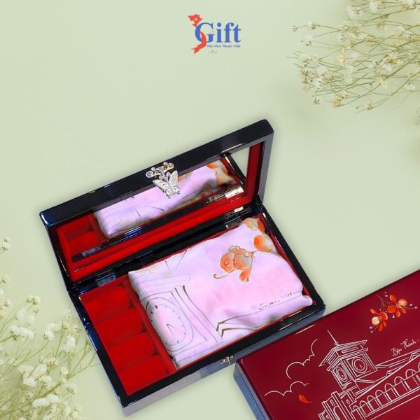 Mỗi món quà chứa đều bảo một thông điệp, một câu chuyện riêng, và sự kết hợp giữa khăn lụa Hà Đông vẽ Chợ Bến Thành cùng hộp trang sức sơn mài chính là giao thoa hoàn hảo giữa nghệ thuật truyền thống và giá trị văn hóa Việt Nam.