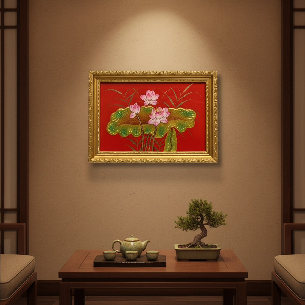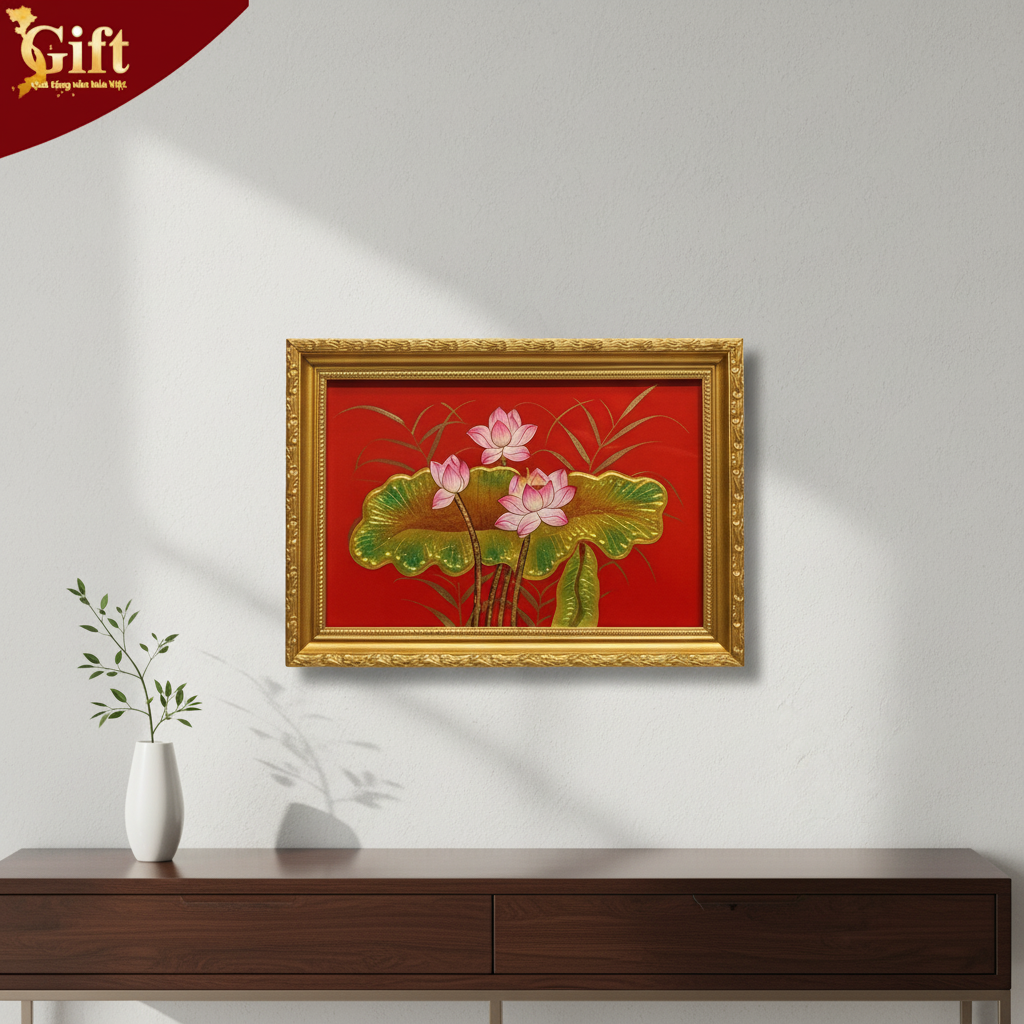 Bộ tranh sơn mài hoa sen nền đỏ – Đẳng cấp quà tặng Việt