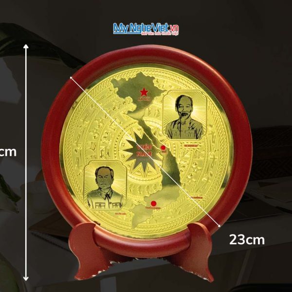 Đĩa đồng lưu niệm BÁC HỒ BÁC GIÁP D23(cm) – một tuyệt phẩm nghệ thuật kết tinh từ bàn tay tài hoa của nghệ nhân, là sự giao hòa giữa giá trị truyền thống và lòng tự hào dân tộc. Phía mặt chính của đĩa nổi bật với hình ảnh chân dung Chủ tịch Hồ Chí Minh và Đại tướng Võ Nguyên Giáp, hai biểu tượng bất diệt trong lịch sử dựng nước và giữ nước của Việt Nam. Bên cạnh đó, họa tiết bản đồ Việt Nam cùng hình sao vàng rực rỡ mang ý nghĩa thiêng liêng về chủ quyền lãnh thổ, khơi dậy lòng biết ơn cùng khát vọng vươn cao của mỗi người Việt.