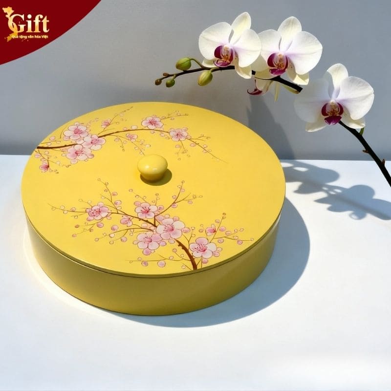 Điểm nhấn nổi bật của HMTBL11/7 nằm ở nền vàng ánh kim ấm áp, gam màu thường gắn liền với tài lộc, thịnh vượng và may mắn. Trên nắp hộp là họa tiết hoa đào/hoa mai cách điệu, được vẽ tay mềm mại, tượng trưng cho khởi đầu mới, bình an và hạnh phúc. Mỗi chi tiết đều được chăm chút tỉ mỉ, tạo nên chiều sâu thẩm mỹ và cảm giác cao cấp – điều mà những sản phẩm công nghiệp khó có thể mang lại.