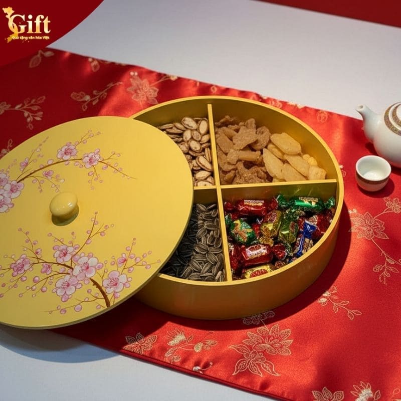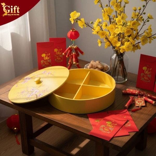 Với thiết kế sang trọng, ý nghĩa phong thủy tốt lành và giá trị thủ công cao, Hộp mứt 4 ngăn nền vàng D30xH7 HMTBL11/4 là lựa chọn lý tưởng để:
