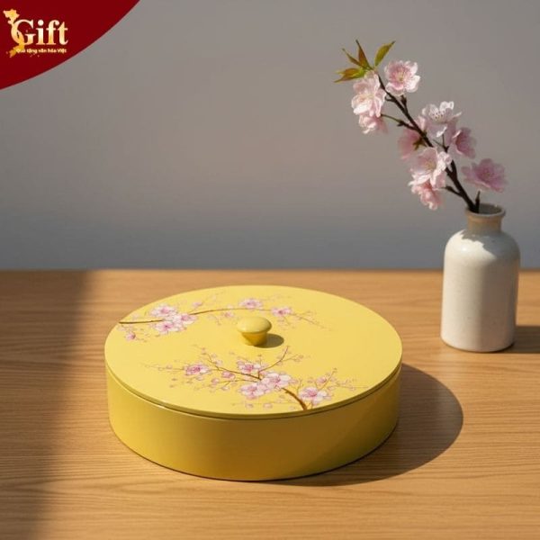 Trong văn hóa Tết cổ truyền Việt Nam, hộp mứt không chỉ là vật dụng đựng bánh kẹo mà còn mang ý nghĩa sum vầy, sung túc và hiếu khách. Hộp mứt 4 ngăn nền vàng hộp vàng D30xH7 HMTBL11/7 là sự kết hợp hài hòa giữa công năng tiện ích và giá trị thẩm mỹ truyền thống, góp phần làm nên không khí Tết trang trọng và ấm cúng trong mỗi gia đình. Với thiết kế tròn cân đối, gam vàng phú quý chủ đạo cùng họa tiết hoa xuân vẽ tay tinh tế, sản phẩm không chỉ phù hợp sử dụng trong gia đình mà còn là món quà Tết cao cấp đầy ý nghĩa dành tặng người thân, đối tác, khách hàng.