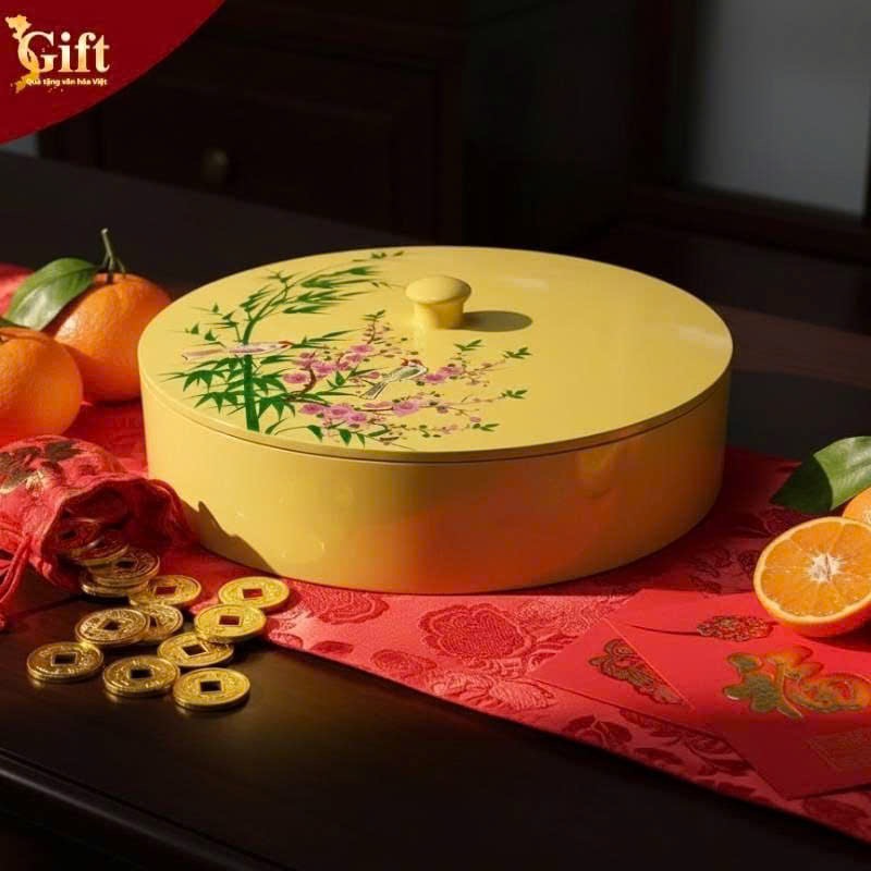 Hộp mứt được hoàn thiện theo phong cách sơn mài thủ công, bề mặt mịn, độ bóng cao, dễ lau chùi và sử dụng bền bỉ theo thời gian. Kết cấu chắc chắn giúp hộp giữ form đẹp, không cong vênh, phù hợp sử dụng lâu dài hoặc trưng bày nhiều mùa Tết liên tiếp. Đây không chỉ là một vật dụng thời vụ, mà còn là món đồ trang trí bàn trà mang giá trị văn hóa.