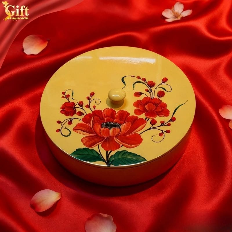 Sản phẩm nổi bật với tông vàng chủ đạo, gam màu biểu trưng cho phú quý, thịnh vượng và tài lộc. Nắp hộp được vẽ tay họa tiết hoa đỏ nở rộ, mềm mại nhưng đầy sức sống, tượng trưng cho may mắn, hỷ sự và khởi đầu viên mãn trong năm mới. Trên nền sơn mài bóng mịn, từng đường nét hoa văn hiện lên nổi bật, tạo chiều sâu và cảm giác ấm áp cho không gian trưng bày.