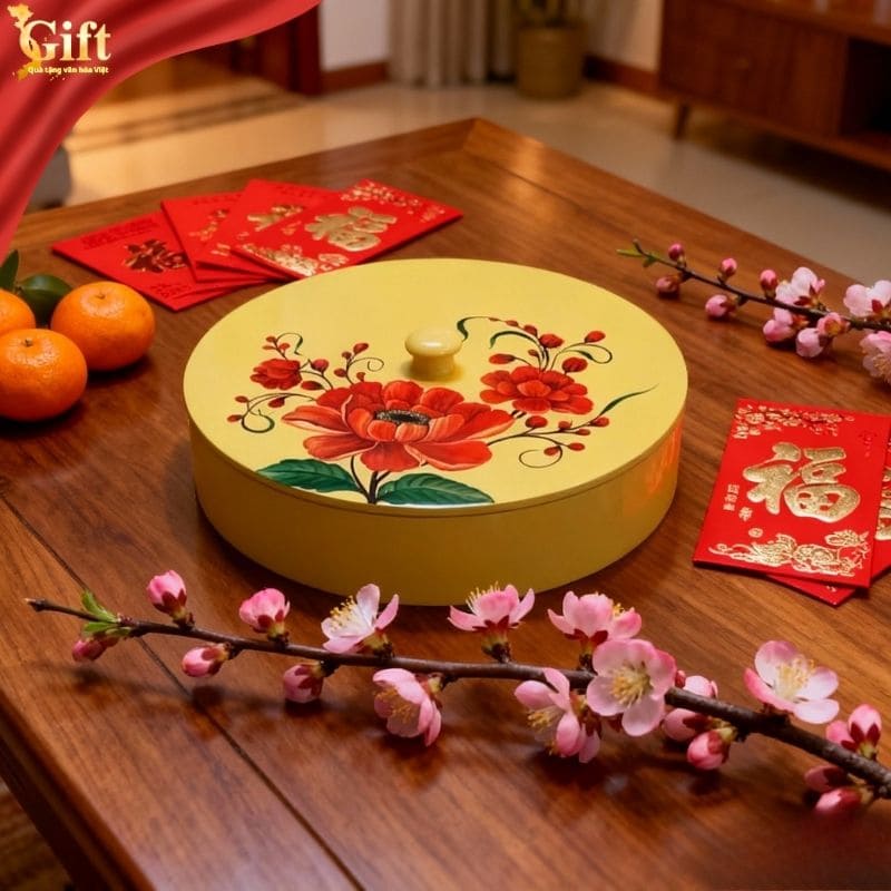 Hình dáng tròn truyền thống mang ý nghĩa đoàn viên, sum họp, rất phù hợp để đặt giữa bàn trà, bàn tiếp khách hoặc mâm bánh mứt ngày Tết.