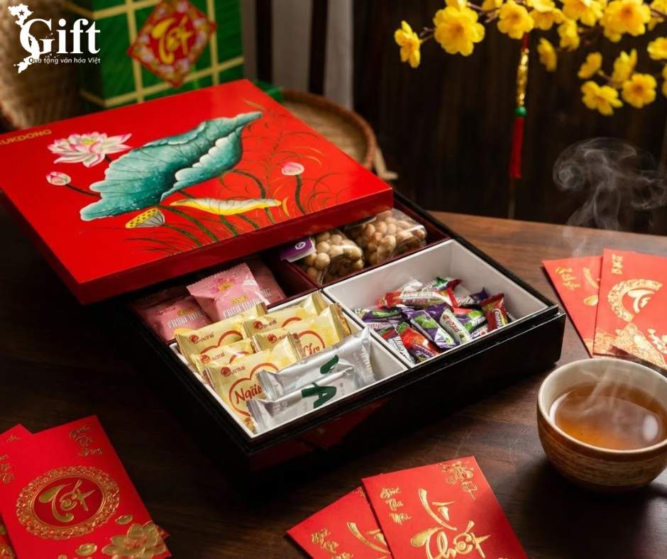 Điểm Nhấn Quý Phái: Màu Đỏ nổi bật cùng Hoa Sen tinh tế. Chiếc hộp biến thành vật phẩm trang trí nội thất sang trọng. Nó nâng tầm không gian phòng khách ngày Tết một cách ngoạn mục.