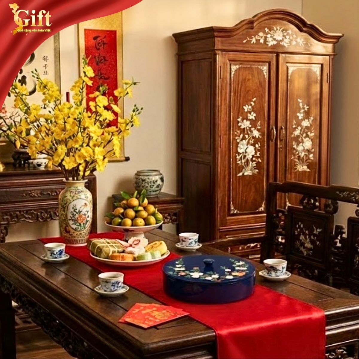 Tết Nguyên Đán không chỉ là thời khắc chuyển giao năm mới, mà còn là dịp để mỗi gia đình gìn giữ nếp nhà, trao gửi lời chúc an khang và vun đắp sự sum vầy. Trong không gian Tết truyền thống ấy, Hộp mứt Tết sơn mài Lam Ngọc Mai Chi 4 ngăn nền xanh HMTBL08/2 không đơn thuần là vật dụng đựng mứt bánh, mà là một tác phẩm nghệ thuật mang đậm giá trị văn hóa Việt. Từ các làng nghề nổi tiếng như Hạ Thái, Bối Khê, Cát Đằng, Tương Bình Hiệp, nghệ nhân Việt đã lưu giữ và phát triển nghệ thuật sơn mài truyền thống qua hàng trăm năm.