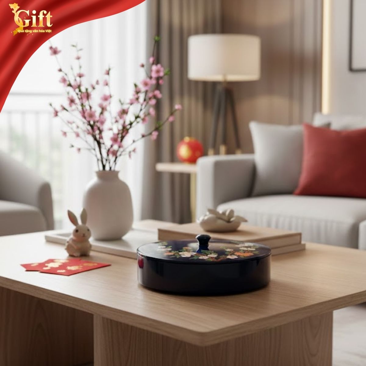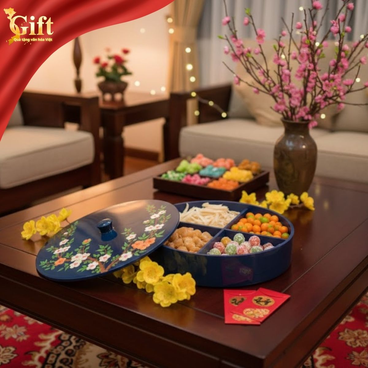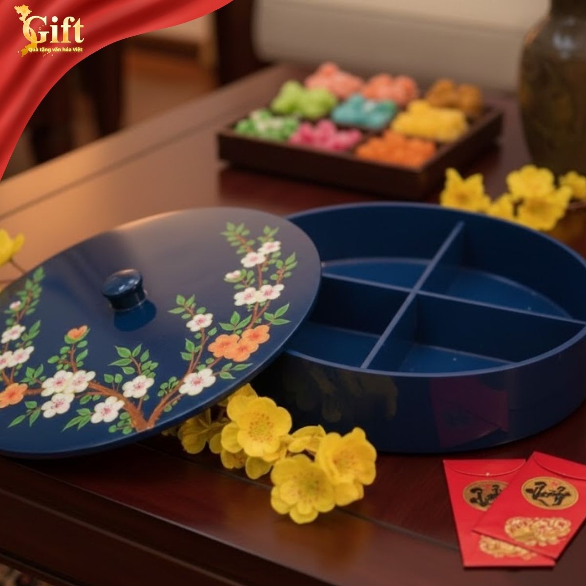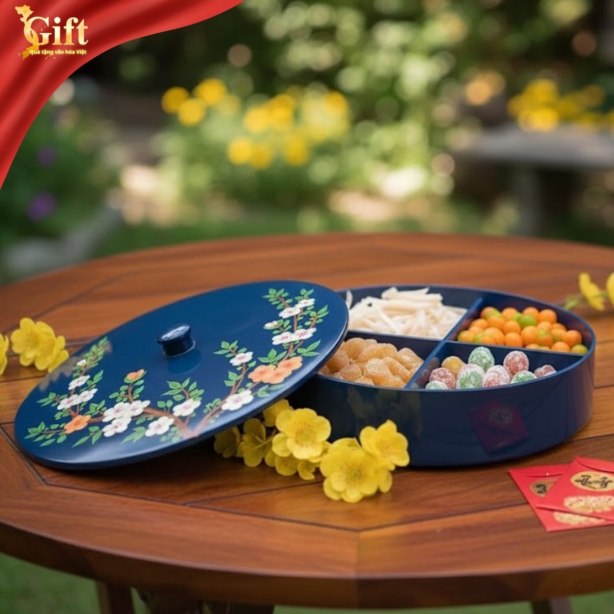 Hộp mứt được chế tác trên nền sơn mài xanh lam ngọc sâu thẳm, gam màu tượng trưng cho sự bình an, trí tuệ và may mắn trong năm mới. Bề mặt sơn mài bóng mịn, có chiều sâu, phản chiếu ánh sáng dịu nhẹ, tạo cảm giác sang trọng nhưng không phô trương – rất phù hợp với không gian phòng khách ngày Tết. Thiết kế dáng tròn 4 ngăn mang ý nghĩa viên mãn, đủ đầy, tượng trưng cho sự sum họp và tròn vẹn phúc lộc. Các ngăn được chia khoa học, thuận tiện để bày biện nhiều loại mứt, hạt, bánh truyền thống.