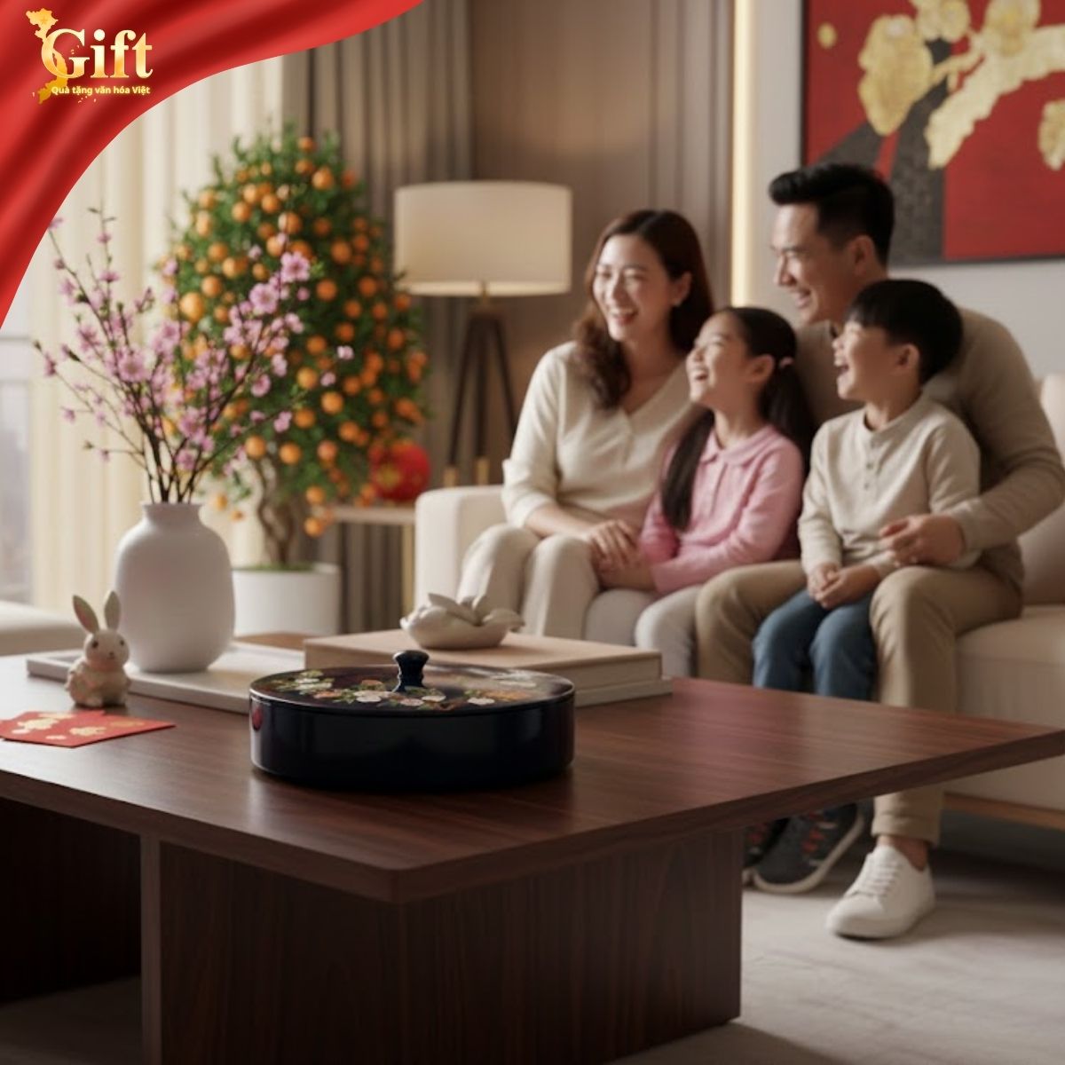 Với thiết kế trang nhã và ý nghĩa tốt lành, Hộp mứt Tết sơn mài Lam Ngọc Mai Chi 4 ngăn là lựa chọn lý tưởng để:
