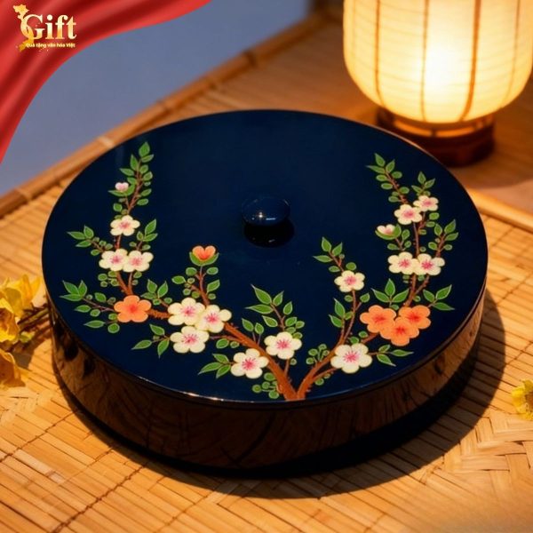 Sản phẩm được làm từ sơn mài truyền thống, trải qua nhiều công đoạn công phu: tạo vóc, sơn lót, mài, vẽ, phủ bóng. Nhờ đó, hộp mứt không chỉ đẹp trong dịp Tết mà còn bền bỉ, có thể sử dụng nhiều năm, trở thành vật phẩm lưu giữ ký ức Tết của gia đình. Bên trong hộp được xử lý gọn gàng, dễ vệ sinh, đảm bảo an toàn khi sử dụng để đựng thực phẩm khô như mứt, hạt, bánh.