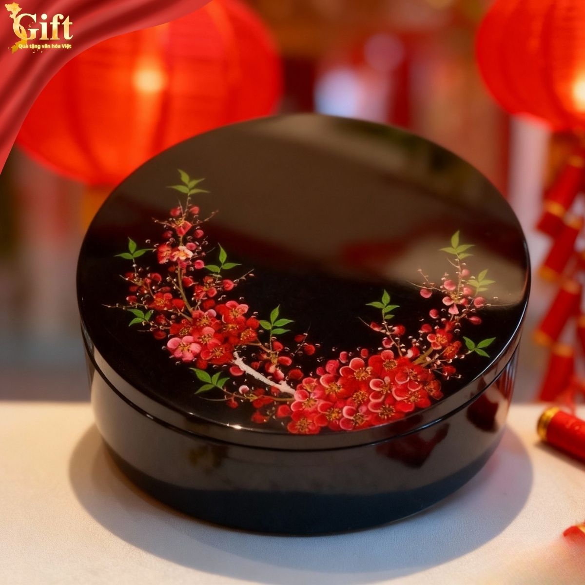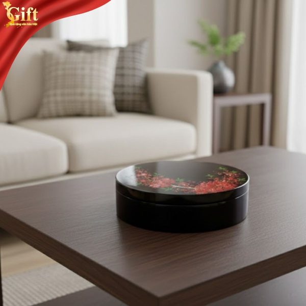 Hộp mứt Mai Đỏ Đón Xuân được chế tác theo quy trình sơn mài truyền thống, trải qua nhiều công đoạn công phu như tạo vóc, sơn lót, mài, vẽ tay và phủ hoàn thiện. Nhờ đó, sản phẩm có độ bền cao, màu sắc ổn định và có thể sử dụng qua nhiều mùa Tết mà vẫn giữ được vẻ đẹp ban đầu.
