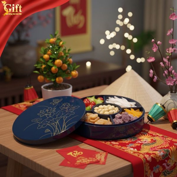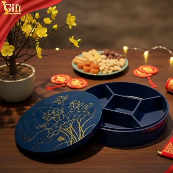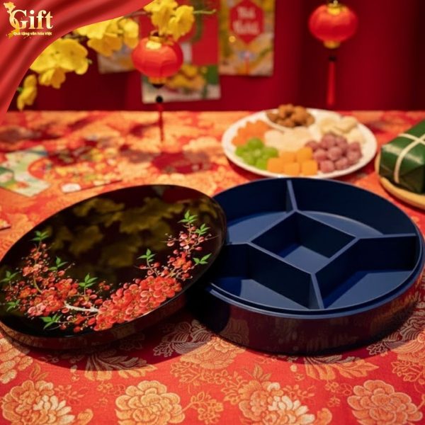 Thiết kế dáng tròn 5 ngăn tượng trưng cho sự đủ đầy, viên mãn và sum họp. Cách chia ngăn khoa học giúp gia chủ dễ dàng bày biện nhiều loại mứt, hạt, bánh truyền thống, vừa tiện dụng vừa đẹp mắt trong những ngày đầu xuân.