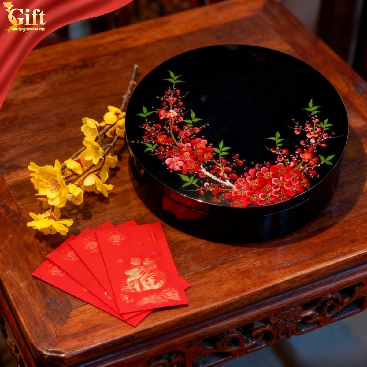 Với thiết kế nổi bật và ý nghĩa phong thủy cát lành, Hộp Mứt Tết Sơn Mài Mai Đỏ Đón Xuân 5 Ngăn là lựa chọn lý tưởng để: