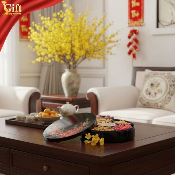 Tết Nguyên Đán là dịp để mỗi gia đình chăm chút không gian sống, chuẩn bị những món quà và vật phẩm mang ý nghĩa tốt lành cho năm mới. Trong không gian tiếp khách ngày Tết, Hộp Mứt Tết Sơn Mài Mai Đỏ Đón Xuân 5 Ngăn HMTBL06/1 không chỉ là vật dụng bày mứt bánh, mà còn là biểu tượng văn hóa gửi gắm lời chúc may mắn – hỷ sự – phú quý.