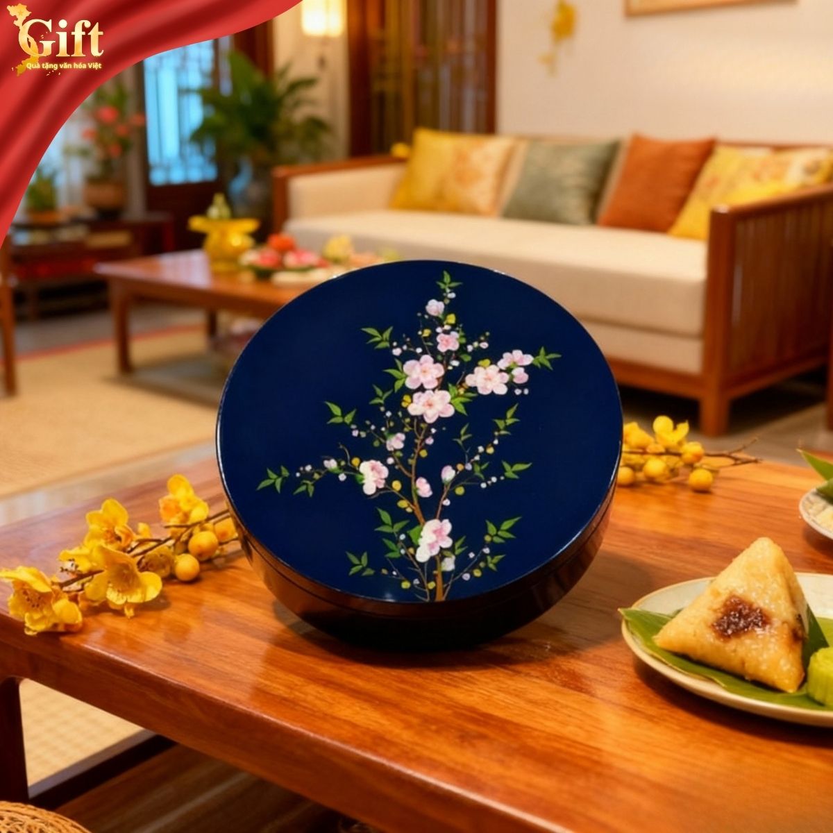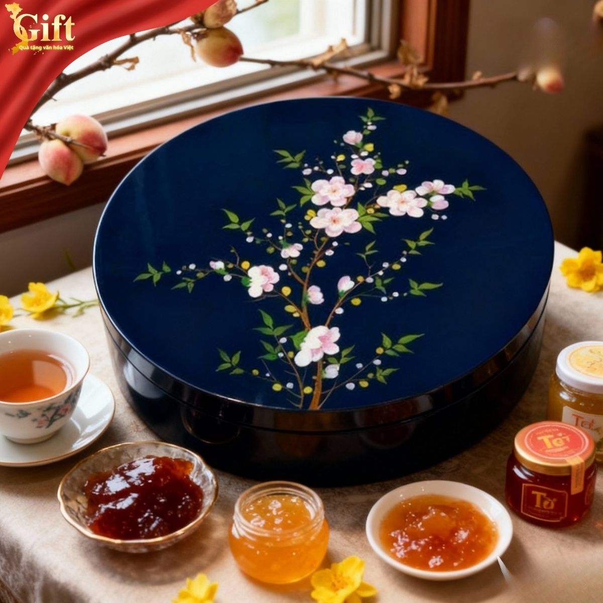 Hộp mứt được chế tác theo kỹ thuật sơn mài truyền thống, trải qua nhiều công đoạn công phu như tạo vóc, sơn lót, mài, vẽ tay và phủ bóng. Nhờ đó, sản phẩm có độ bền cao, màu sắc ổn định và có thể sử dụng trong nhiều mùa Tết liên tiếp. Bên trong dễ lau chùi, phù hợp đựng các loại mứt, hạt khô. Đây không chỉ là món đồ dùng ngày Tết, mà còn là vật phẩm lưu giữ ký ức Tết của gia đình qua từng năm.