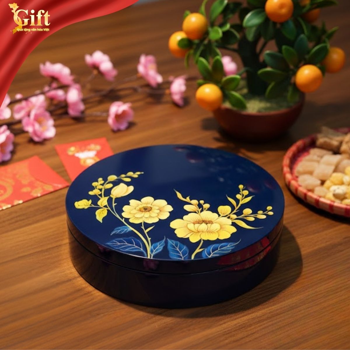 Bên trong hộp được xử lý gọn gàng, dễ vệ sinh, phù hợp đựng các loại mứt, hạt khô trong dịp Tết. Đây không chỉ là món đồ dùng mùa vụ, mà còn là vật phẩm lưu giữ ký ức Tết của gia đình qua từng năm.