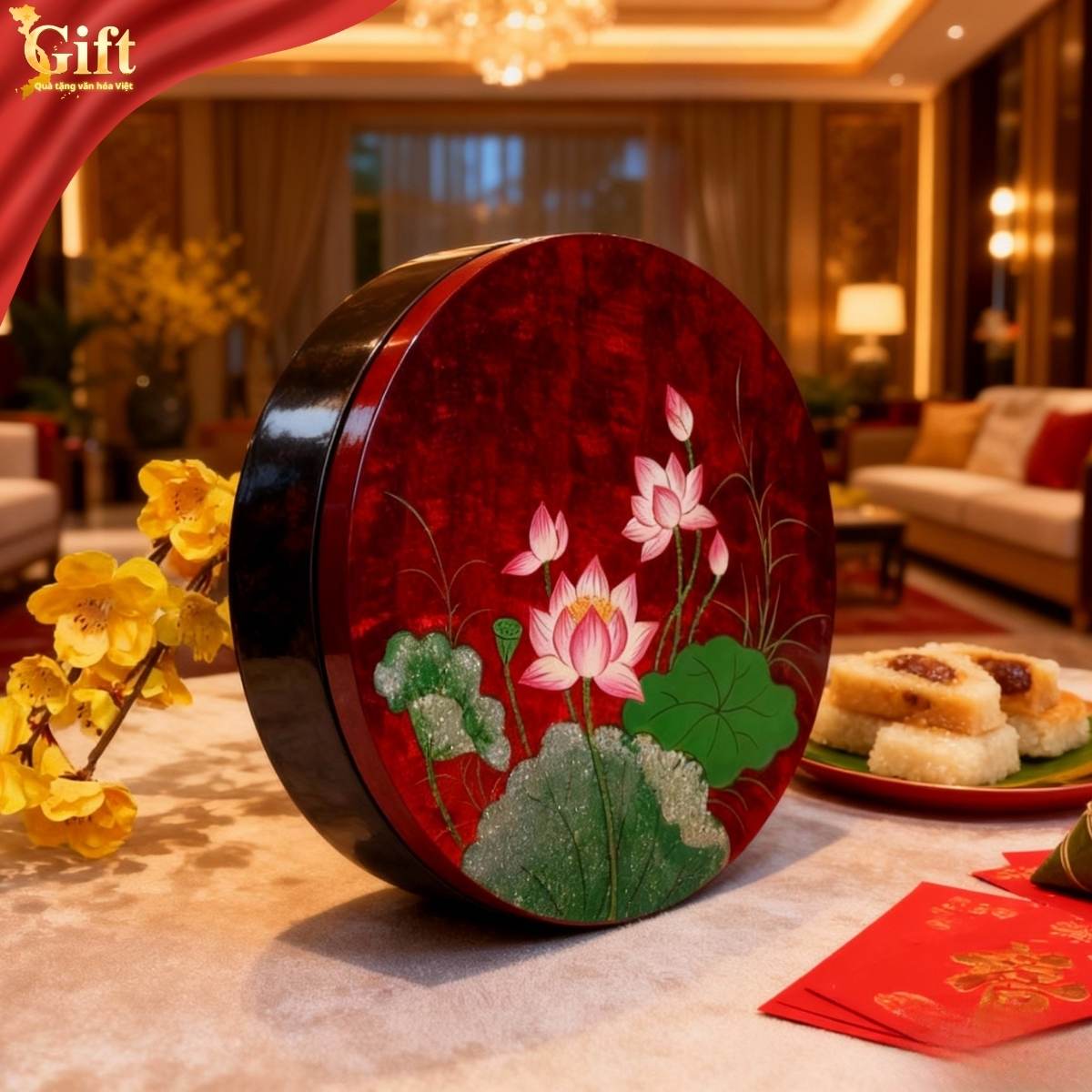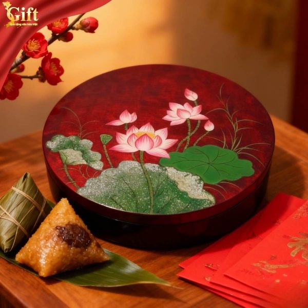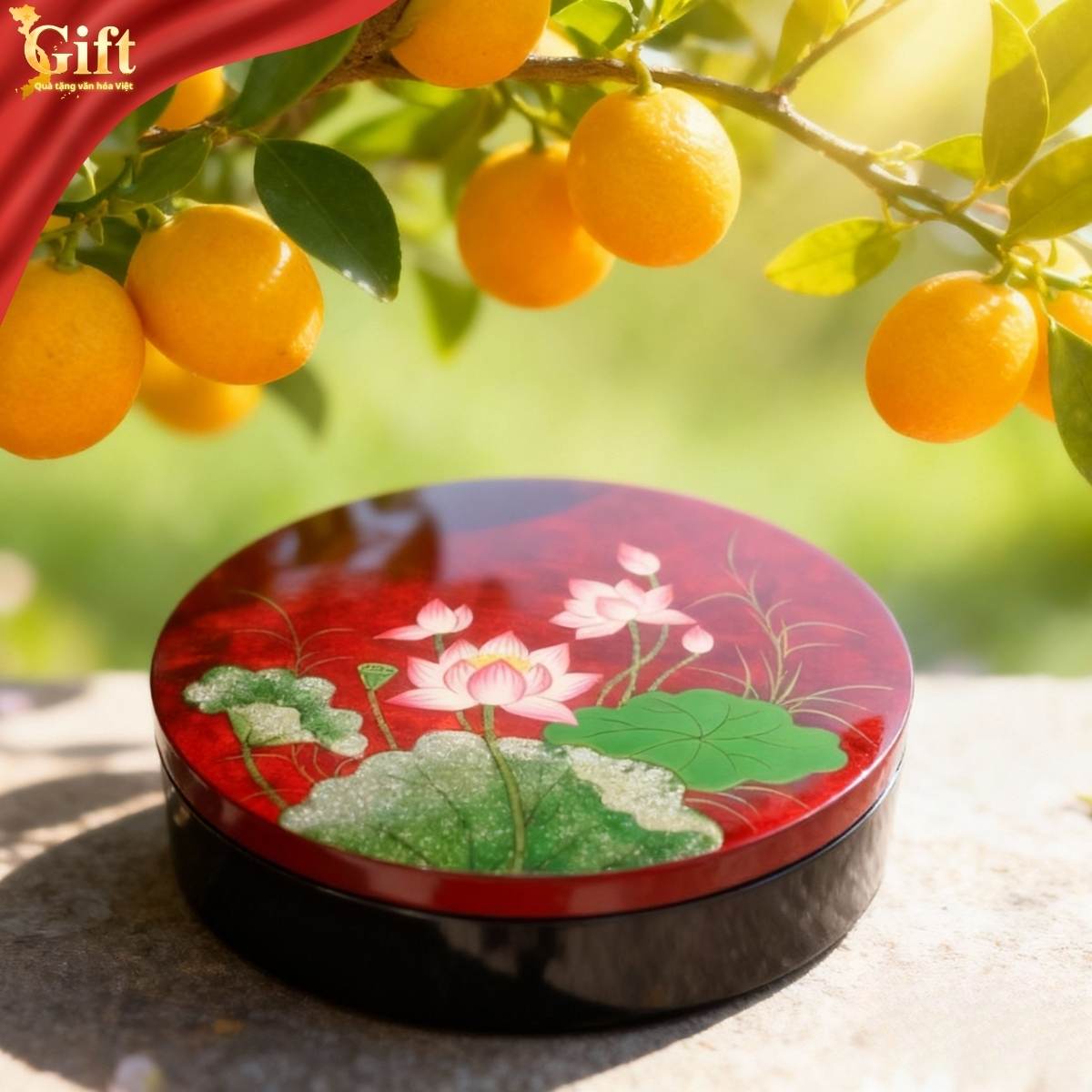 Tên sản phẩm: Hộp mứt Tết Sơn mài Sen Hồng Thanh Khiết.