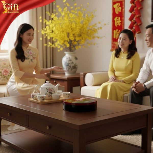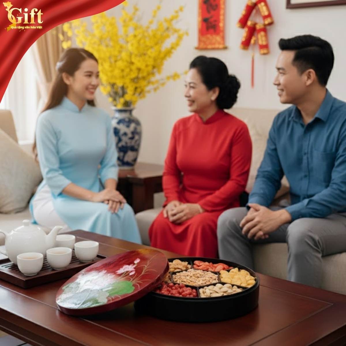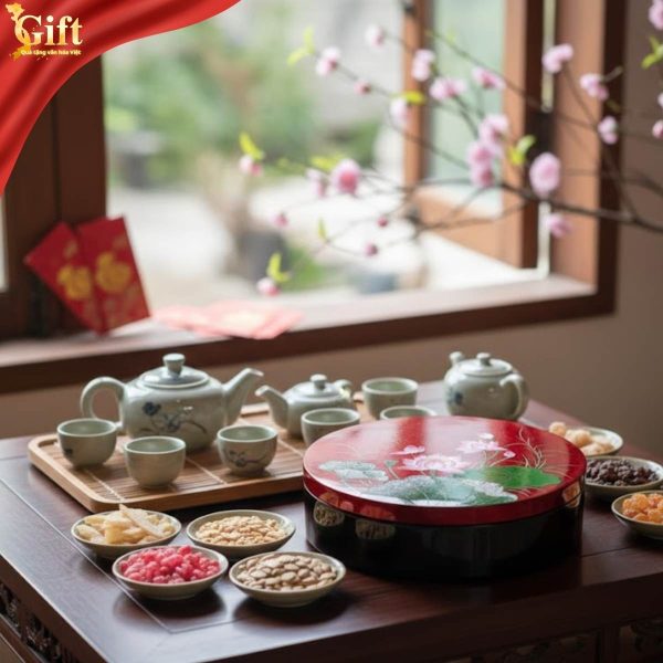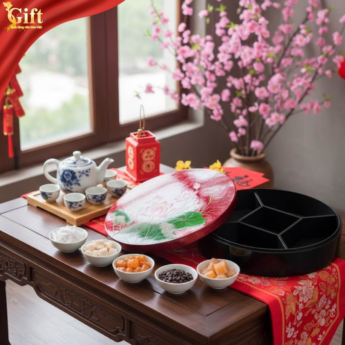 Hộp mứt sơn mài Mai Vàng nền đỏ có vẻ ngoài sang trọng. Nó là lựa chọn hàng đầu cho Quà Tết doanh nghiệp.