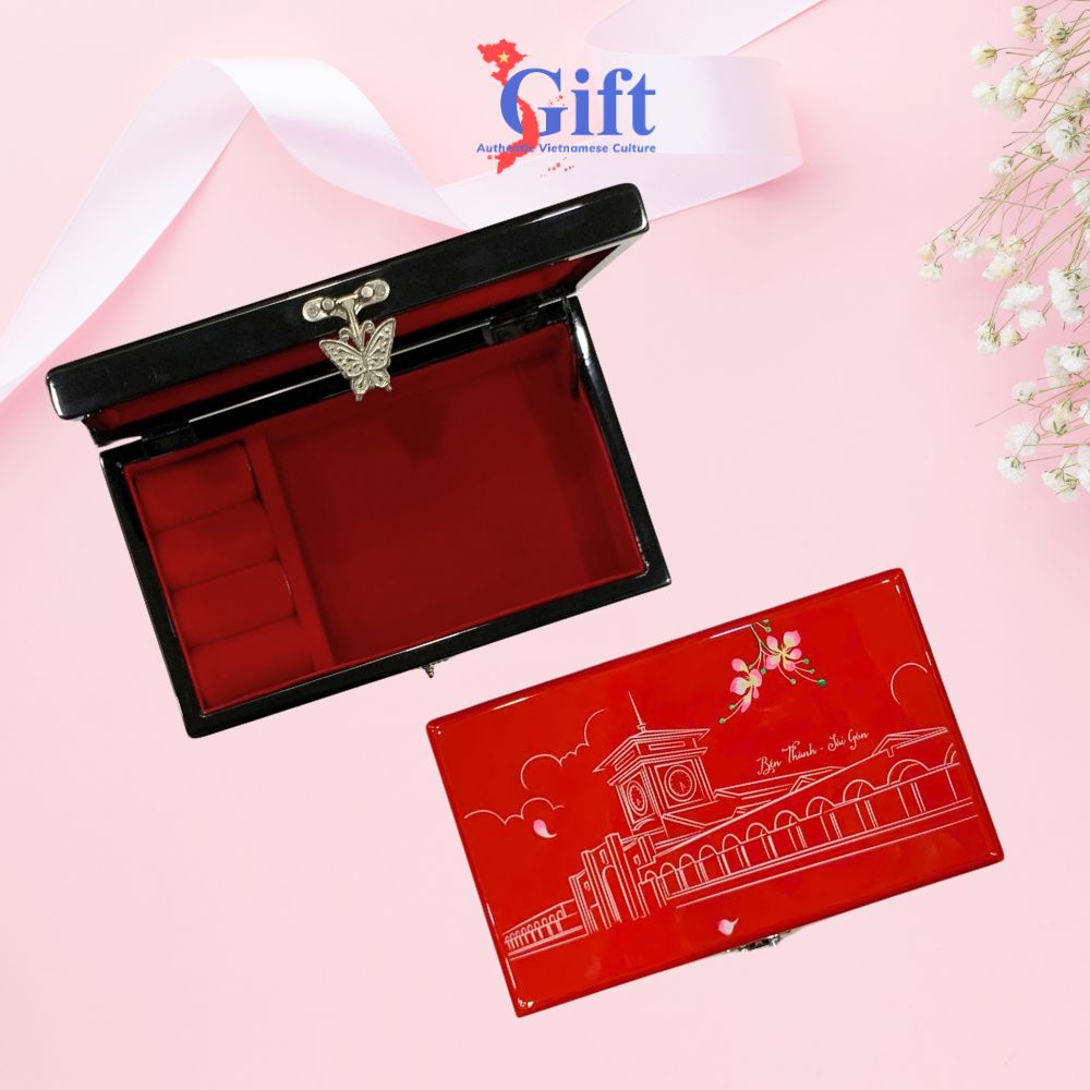 Hộp Trang Sức Sơn Mài Nhỏ Màu Đỏ Vẽ Chợ Bến Thành SGSMHD1220-2