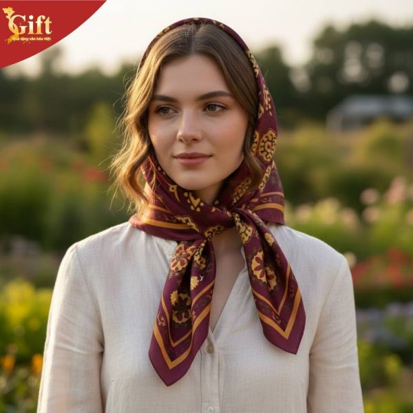 Khăn lụa SG-HBNTV110 sở hữu họa tiết đối xứng hình học và hoa văn truyền thống Trung Á, lấy cảm hứng từ kiến trúc và nghệ thuật trang trí cổ điển Uzbek. Với màu đỏ mận trầm kết hợp vàng ánh kim và xanh olive tạo nên vẻ đẹp vừa cổ điển, vừa quyền quý, dễ dàng phối cùng nhiều phong cách thời trang khác nhau.