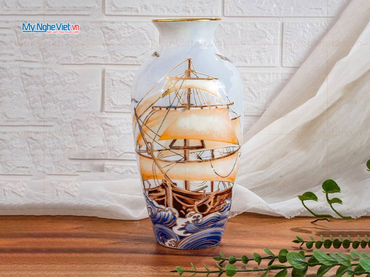 Họa tiết “Thuận Buồm Xuôi Gió” được các nghệ nhân Bát Tràng khắc họa một cách sống động và tinh tế trên nền men gốm. Hình ảnh con thuyền no gió ra khơi không chỉ thể hiện sự tự do, mạnh mẽ mà còn là lời chúc cho mọi công việc, dự định được suôn sẻ, hanh thông, gặt hái nhiều thành công và tài lộc. Bình hoa Bát Tràng với họa tiết này không chỉ đơn thuần là một vật trang trí mà còn là vật phẩm phong thủy mang đến năng lượng tích cực, may mắn cho gia chủ.
