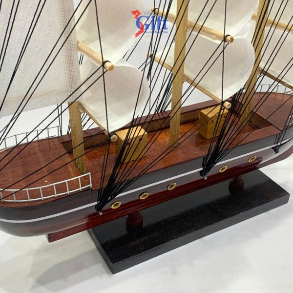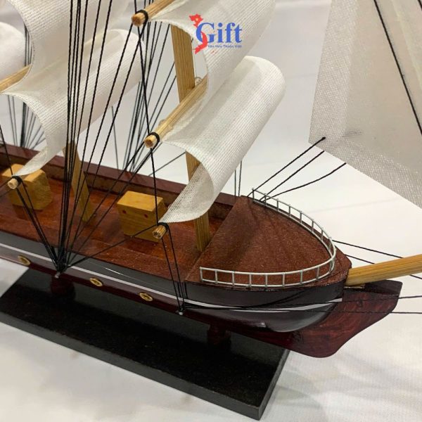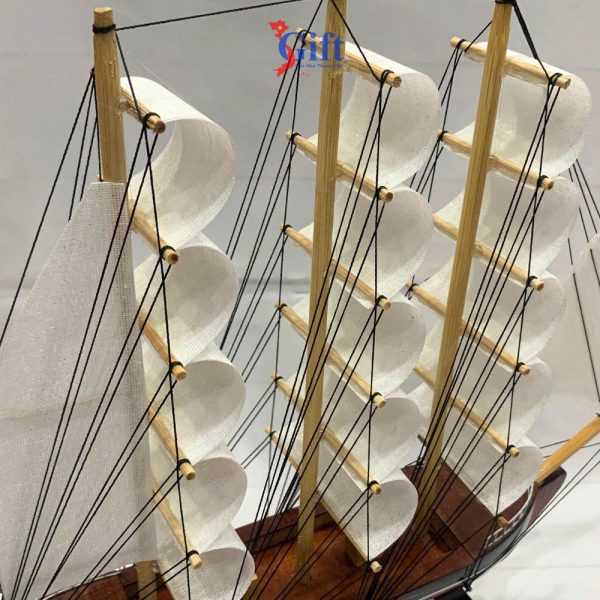 Mỗi chiếc thuyền được các nghệ nhân lành nghề chế tác thủ công, sử dụng chất liệu gỗ tự nhiên, vải buồm cao cấp và dây buộc mô phỏng chuẩn xác các chi tiết của con tàu nguyên bản. Sự kết hợp giữa màu gỗ trầm ấm và sắc trắng thanh lịch của buồm tạo nên tổng thể hài hòa, sang trọng, phù hợp để trưng bày tại phòng khách, phòng làm việc hay sảnh công ty.