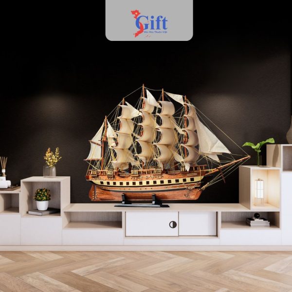 Mỗi chiếc thuyền được các nghệ nhân lành nghề chế tác thủ công, sử dụng chất liệu gỗ tự nhiên, vải buồm cao cấp và dây buộc mô phỏng chuẩn xác các chi tiết của con tàu nguyên bản. Sự kết hợp giữa màu gỗ trầm ấm và sắc trắng thanh lịch của buồm tạo nên tổng thể hài hòa, sang trọng, phù hợp để trưng bày tại phòng khách, phòng làm việc hay sảnh công ty.