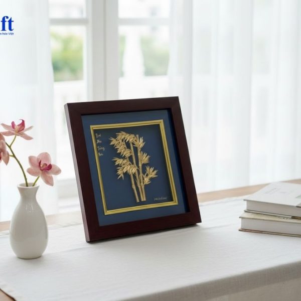 Thiết kế Nền Xanh Ấn Tượng: Màu xanh nền tranh tạo sự tương phản nổi bật. Nó làm nổi bật hình ảnh tre trúc dát vàng. Thiết kế này mang lại cảm giác hài hòa, tươi mới. Dễ dàng hòa hợp với mọi không gian nội thất.
