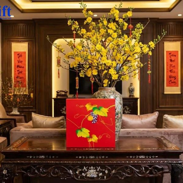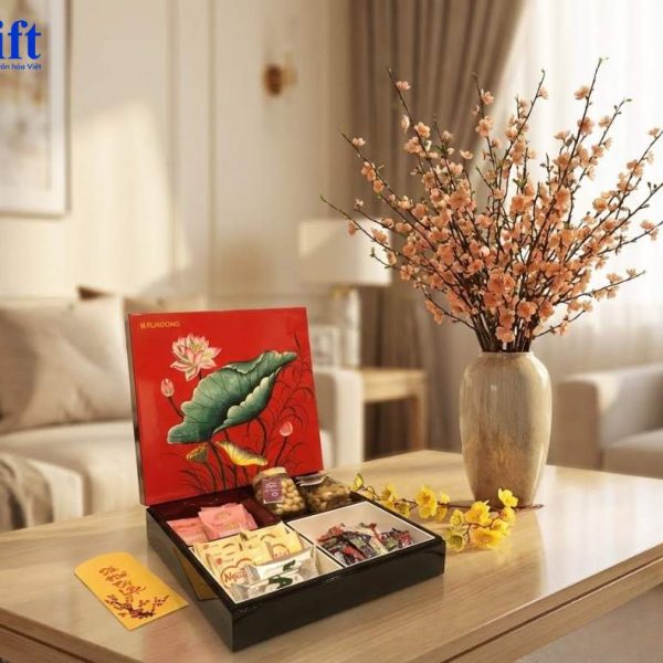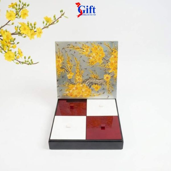 Hộp Mứt Sơn Mài Vuông 4 Ngăn Đắp Nổi Hoa Quả Nền Đỏ SGHM04 – Quà Tết Ý Nghĩa, Sang Trọng